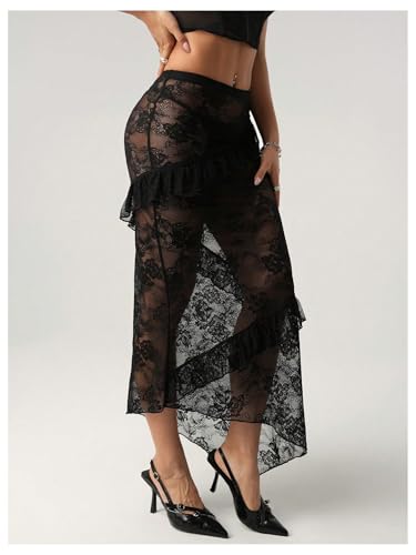 More information about Verdusa Women's Gothic Floral Lace Sheer Maxi Skirt Drop Waist Asymmetrical Ruffle Bodycon Skirts