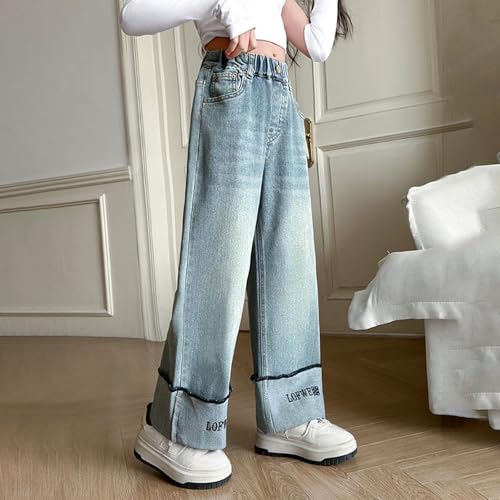 Girls Straight Leg Jeans Baggy Elastic Waist Wash Denim Pants Solid Casual Embroidery Loose Fit Trousers 6