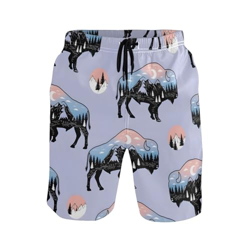 HOT ! Men's Swim Trunks Quick Dry Swimming Shorts with Pocket Buffalo Silhouettes with Landscape Scenes Swimsuit Trunks
