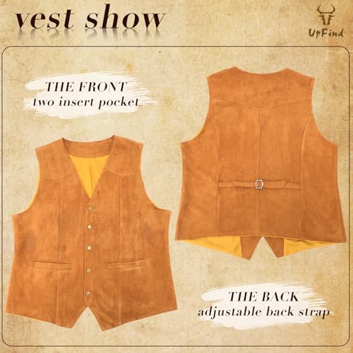 • COWBOY STYLE DESIGN: Suede vest men western is designed with classic brown color, 5-snaps closure, easy to buckle and disassemble, adjustable back strap design, slim fit adds a drape, makes you stand out in the crowd and look eye-catching and handsome.