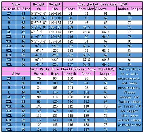 • Size: Please carefully refer to our size table, according to the detailed picture of the measurement method measurement, choose your size, we provide free customization service, if you need to customize, please send your measurement results to us, customized suit will be more suitable for you.