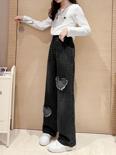 Kids Girls Jeans Raw Edge Heart-Shaped Patch Straight Leg Denim Pants Distressed Washed Denim Trousers 7