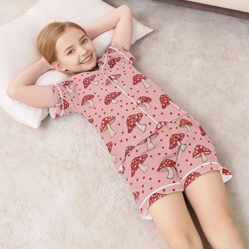 Red Mushroom Pattern Summer Satin Pajama Set, Cute Button-Down Sleepwear Pj Set for Sleep Wears 6