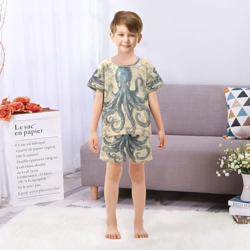 ALAZA Vintage Blue Octopus Nautical Map Retro Pajamas Set Short Sleeve Cotton Sleepwear Summer Pjs 2 Piece 5-14Y 5