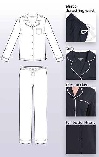 Fabric type: 100% CottonCare instructions: Machine WashOrigin: ImportedTwo-Piece Matching Set - Long-sleeve, button-front top and full-length, relaxed fit pants; savor falling asleep in this timeless, classically styled two-piece matching pajama set for Women featuring a notched collar, a breast pocket, elegant piping on the trim, and an elastic drawstring waist; available in our exclusive rich solids and playful polka dots.Premium Quality - Luxuriously soft, slightly stretchy, perfectly lightweight; this stunning, designed by sleepwear experts Womenβs pajama set is crafted of a high-quality, durable, double-brushed cotton jersey fabric that offers ideal, season after season, touchable coziness. Wear it and love it for years to come.Find the Perfect Size - Our pajamas for women have been designed by sleepwear experts to fit a range of bodies; below you will find a size chart to help you find your perfect fit.Roomy Fit - Our PJs are designed to be relaxed & generously oversized. We recommend if you are between sizes, size down. Please reference the hang tag on your garment for important information about washing and sizing.Shop with Confidence - Have a question for our customer support team? You can contact us by selecting a size and color on this page and clicking the Sold by: link located below the Add to Cart and Buy Now buttons. This link will direct you to a page with our customer support team's phone number and Ask a Question chat link. Perfect for everyday use. finest materials and excellent craftsmanship ensure long-lasting durability.