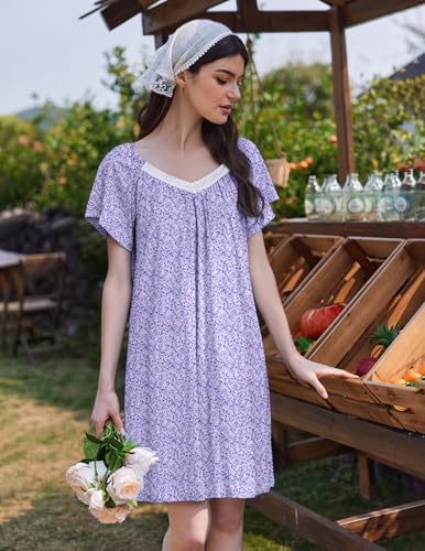 HOT ! Ekouaer Womens Nightgown Lace Trim V Neck Sleep Shirt Flare Short Sleeve Night Gown Pleated Nightshirt Ladies Nightdress