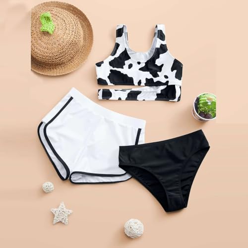 Teen Girls 3 Piece Swimsuit Cow Print Bikini Set with Shorts Cute Bathing Suits Summer Beach Tankini Sports Swimwear 3