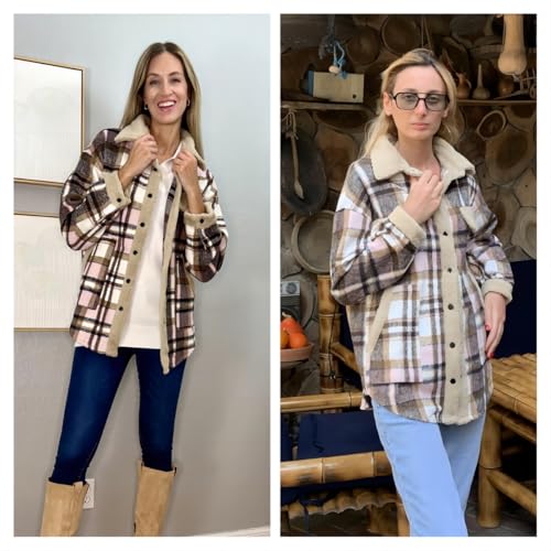 HOTOUCH Flannel Jackets Womens Sherpa Trimmed Shackets Fleece Patchwork Plaid Long Sleeve Button Down Winter Coats S-XXL 4