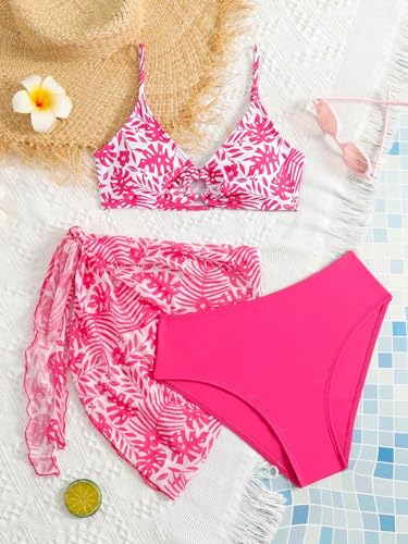 SHENHE Girl's Summer 3 Piece Tropical Cut Out Bikini Set Bathing Suit with Beach Cover Up Skirt 3