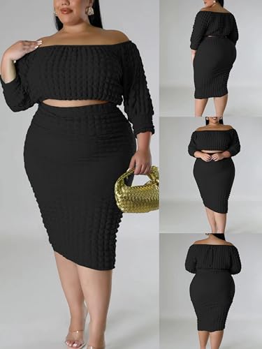 popular ! Women Plus Size 2 Piece Outfits Off Shoulder Dresses Set Sexy Crop Top Casual Bodycon Popcorn Midi Skirt Sets Vacation