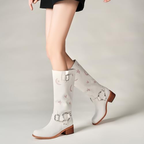 Riding Boots for Women Knee High with Buckle Stars Moon Heart Patterns Low Heel 5