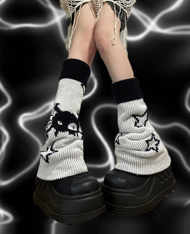 Hopecn Girls Leg Warmers Y2K Skull&Star Print Two Side Wear Knitted Goth Leg Warmer 80s Loose Kawaii Streetwear Socks.