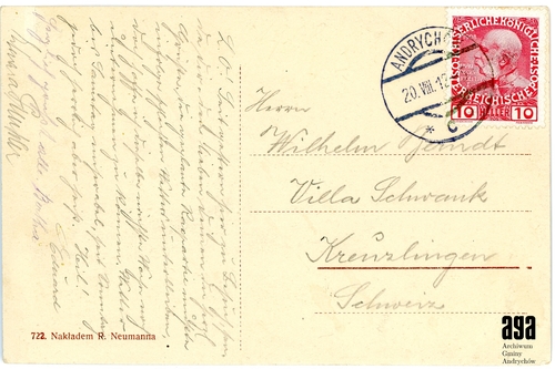 Pocztówka adresowana do Wilhelma Berndt z Kreuzlingen w Szwajcarii; wydana nakładem R. Neumann w Andrychowie. Na awersie widok na Fabrykę Braci Czeczowiczka, willę Czeczowiczków i blok dla robotników od strony południowej.
