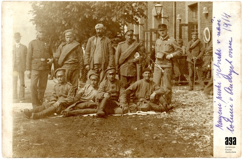 Autor pocztówki nieznany. Na awersie fotografia przedstawiająca rannych rosyjskich pacjentów szpitala wojskowego dla zakaźnie chorych w Andrychowie (funkcjonował od września 1914 r. do sierpnia 1915 r.). Datowanie (1914) na podstawie notatki na pocztówce.