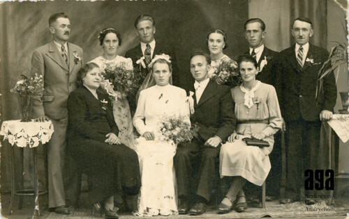 Po stronie pani młodej siedzi małzonka meżczyzyny stojącej za nią. Był to najprawdopodobniej pracodawca pana młodego. Koło pracodawcy siotra Władysława - Maria Kudłacik (drużba), koło niej narzeczony Paweł Smaza, nieznajoma, brat ojca, z wąsem brat ojca Jan, koło pana młodego siedzi żona jednego z braci Władysława.